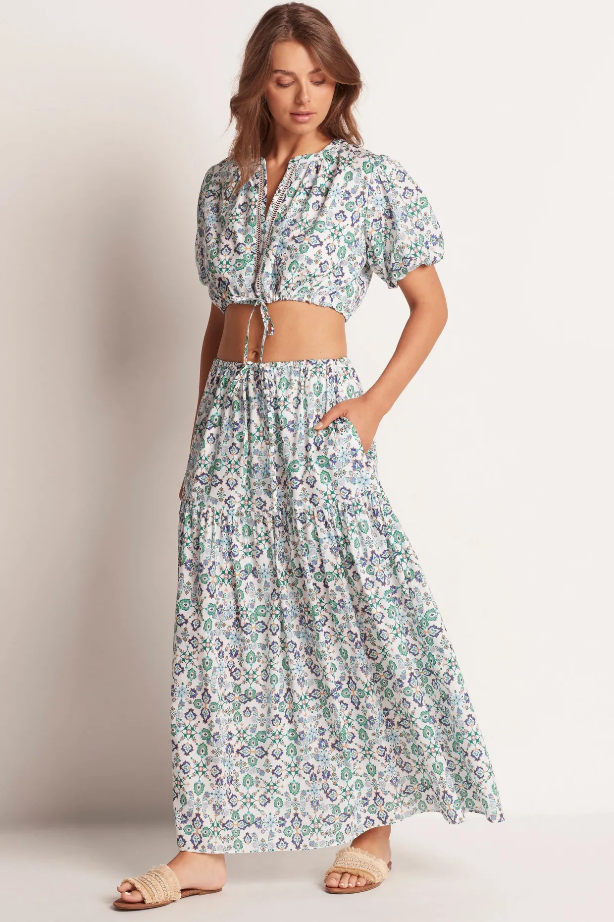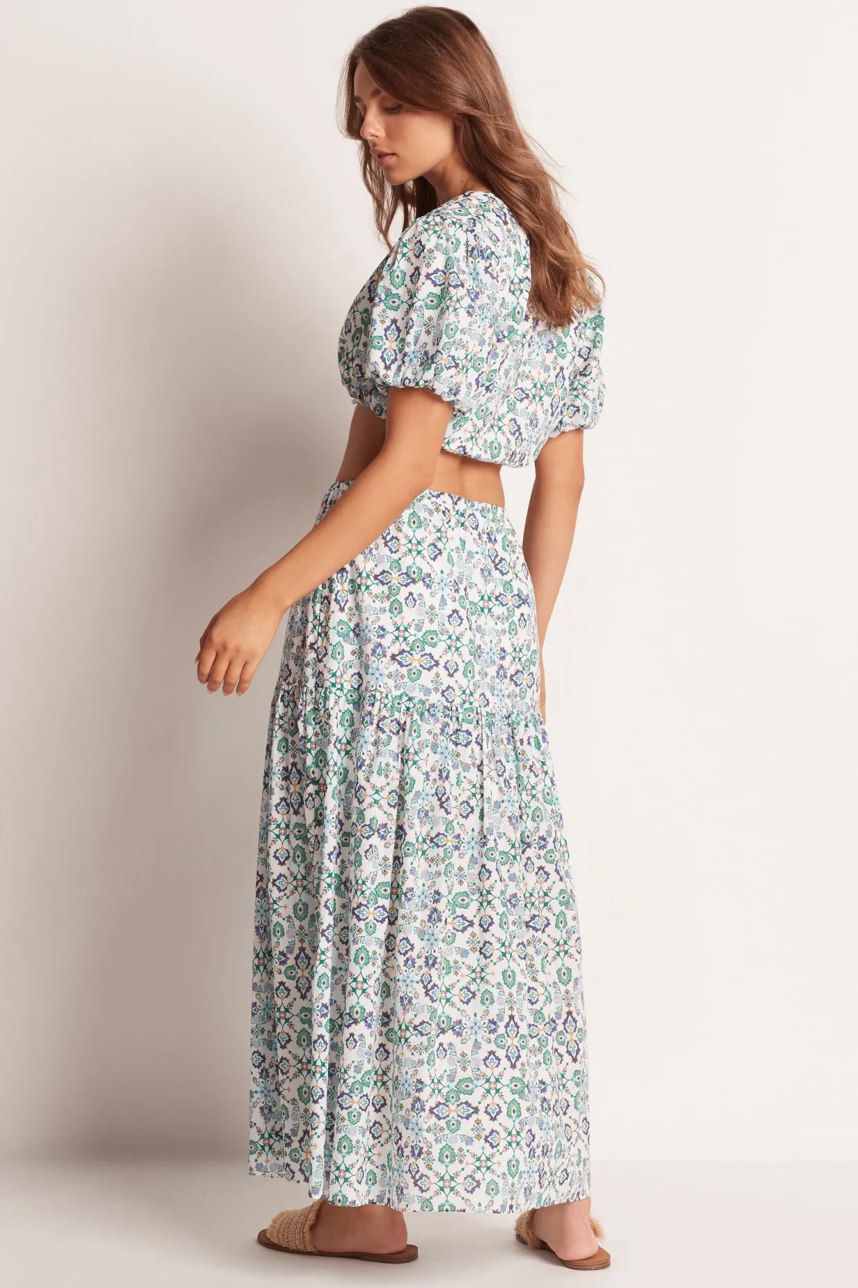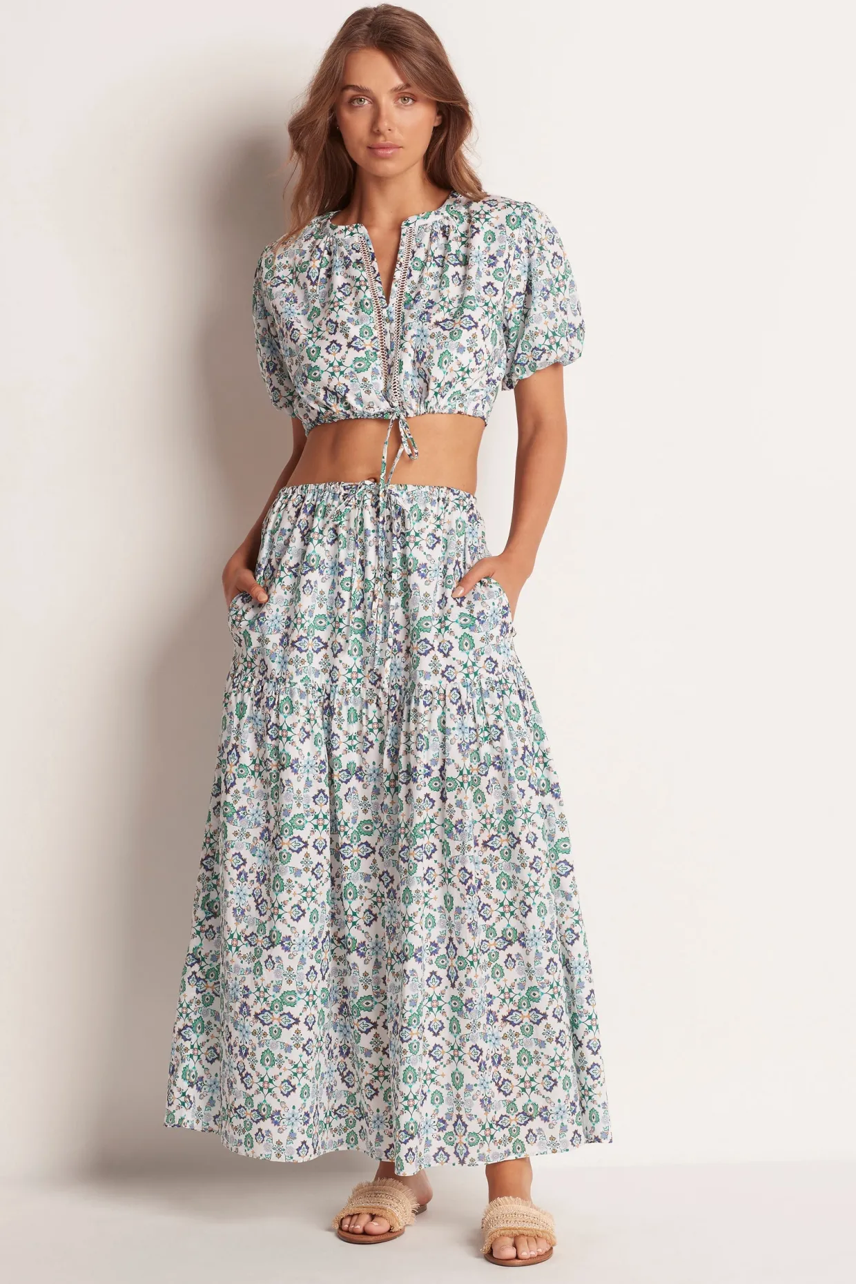 The Charmed Puff Sleeve Top is made from summery cool 100% Organic Cotton. Printed in our exclusive Charmed design with pretty lattice trim inserts on the front V neckline and short puff sleeves.