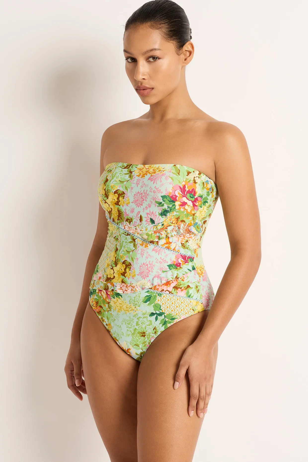 The Olympia Spliced Frill Bandeau One Piece is a pretty, pastel Japanese-inspired floral print featuring our signature flattering diagonal frills.