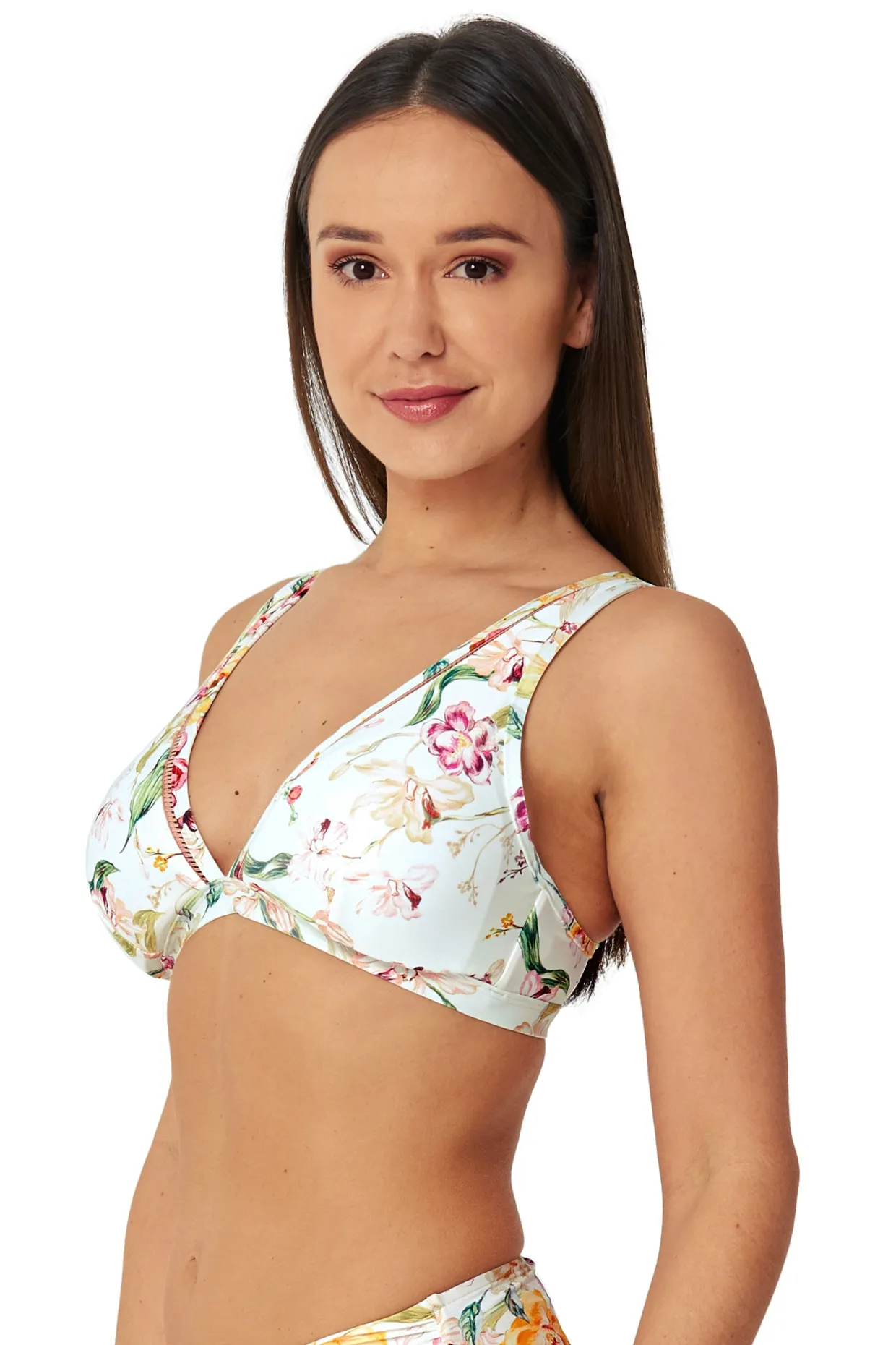 The Sasha Up To A DD Extended Tri Bikini Top from our Cruise 2021 collection features a contrast trim on the front neckline. The hand painted chintz floral is printed on our exclusive Recycled “quick dry” fabric. Fully lined in silky touch lining with elastane for superior fit and body contouring.